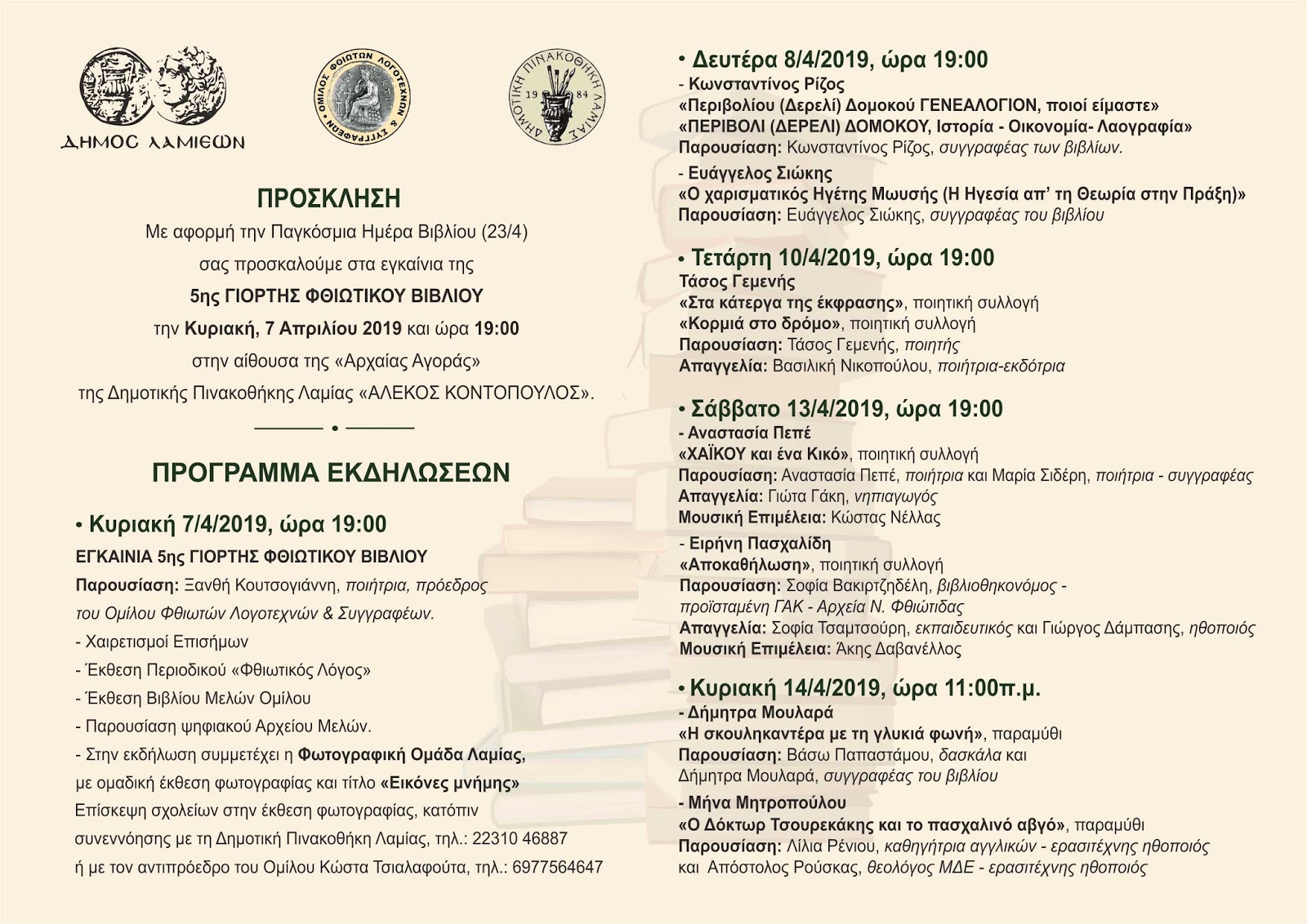 Ο Δήμος Λαμιέων και ο Όμιλος Φθιωτών Λογοτεχνών και Συγγραφέων σας προσκαλούν στη 5η Γιορτή Φθιωτικού Βιβλίου που θα πραγματοποιηθεί στην αίθουσα “Αρχαίας Αγοράς” της Δημοτικής Πινακοθήκης «Αλέκος Κοντόπουλος» από τις 7 Απριλίου έως 14 Μαΐου 2019.